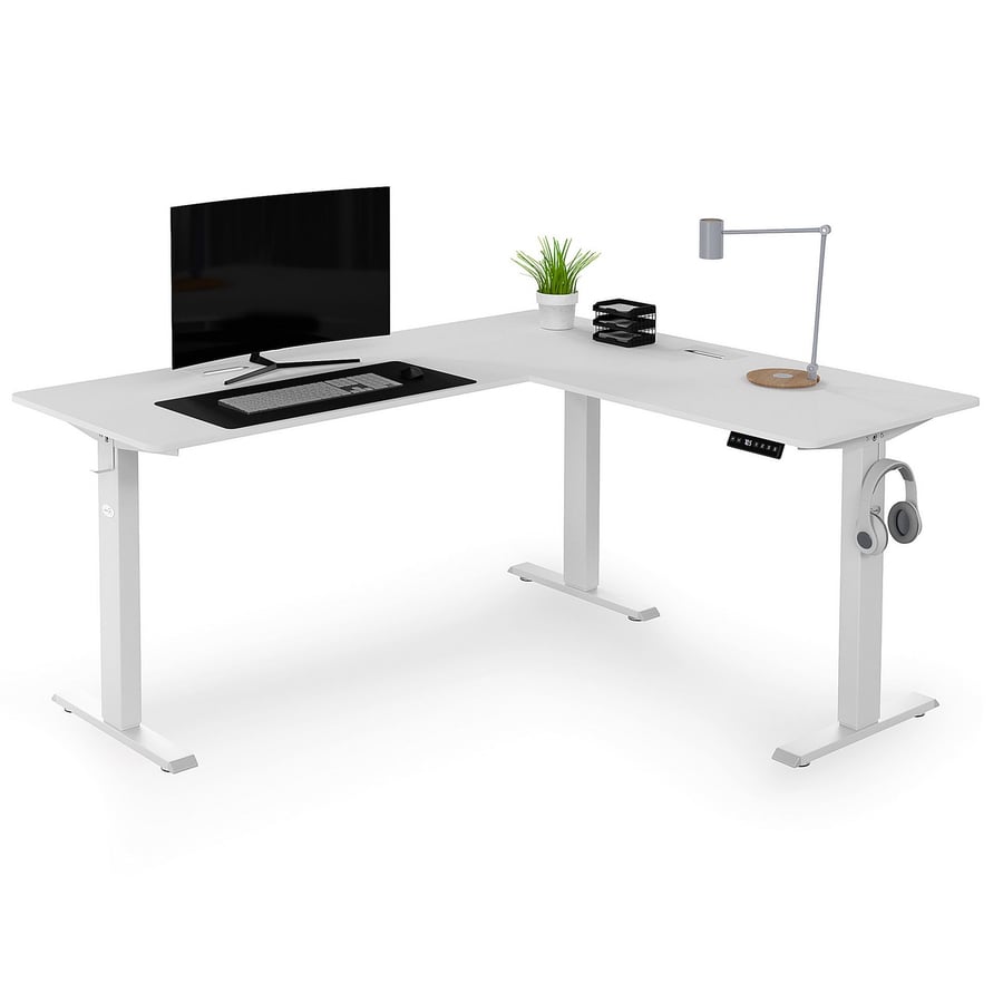 Der elektrische Eckschreibtisch Montaro ist höhenverstellbar, stabil, ergonomisch, mit Speicherfunktion, Kabelmanagement und Platz für Zubehör – ideal für vielseitiges Arbeiten.