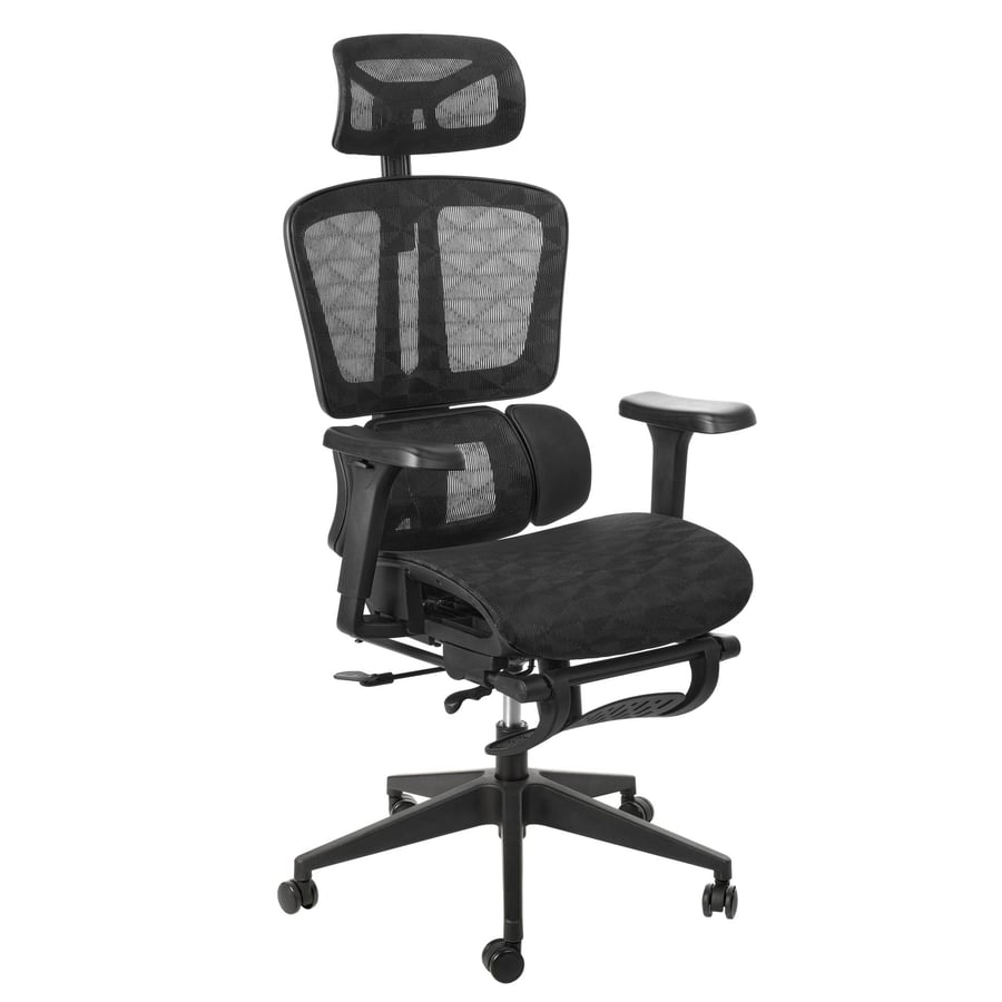 Der Sitz des Drehstuhls Romalo besticht durch sein schwarzes Netzmaterial mit mattem Finish und seine geschwungene Form. So bietet er den ganzen Tag über höchsten Sitzkomfort. Dank seiner Verstellbarkeit (vorne/hinten) lässt er sich an die Länge der Oberschenkel anpassen, was die Durchblutung verbessert und Druckstellen reduziert. Das robuste Nylongestell mit einer Breite von 35 cm und die schwarze Gasdruckfeder mit 8 cm Hub garantieren Stabilität und eine reibungslose Höhenverstellung. Der Bürostuhl Romalo ist mit 360° drehbaren Rollen ausgestattet, die geräuscharm sind, keine Spuren auf dem Boden hinterlassen und eine mühelose Bewegung ermöglichen. Im Lieferumfang ist auch eine praktische schwarze Fußstütze enthalten – ideal für alle, die nach getaner Arbeit ihre Beine ausstrecken möchten.