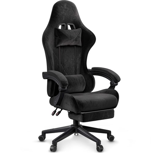 Gamingstuhl Ragazo in Schwarz mit Fußstütze, verstellbarer Rückenlehne, 150 kg Belastbarkeit und ergonomischen Kissen für maximalen Komfort.