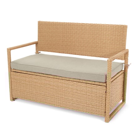 Die wetterfeste Gartenbank Verbana vereint Stil & Funktion: Polyrattan, 180 kg Tragkraft, bequeme Polsterung, Stauraum mit Plane & Gasdruckfeder – ideal für Garten, Balkon & Terrasse.