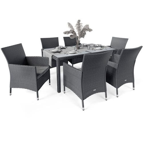 Gartenmöbel VERONA 6+1 von di volio, Set besteht aus 6 bequemen Stühlen und einem geräumigen Tisch. Festes Polyrattan, imprägnierte Sitzkissen, Wetter-/UV-Strahlenbeständig.
