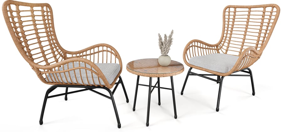 Die Sitzgruppe Sorrento von di volio ist ein stilvolles Gartenmöbel-Set, mit dem Sie den Entspannungsbereich Ihrer Träume im Freien schaffen können. Dank ihrer schlanken Form und ihrer funktionalen Abmessungen eignen sich die Möbel perfekt für Balkon, Garten und Terrasse. Sie können aber auch im Innenbereich, z.B. im Wohnzimmer, eingesetzt werden. Das Set ist ideal für zwei Personen und besteht aus zwei bequemen Sesseln mit Sitzkissen und einem runden Couchtisch. Die Möbel zeichnen sich durch ihr attraktives, modernes Design und die Langlebigkeit der verwendeten Materialien aus. Die Konstruktion aus einem Polyrattan-Geflecht und einem robusten, pulverbeschichteten Stahlrahmen ist stabil und widerstandsfähig gegen die Witterungseinflüsse, denen die Gartenmöbel häufig ausgesetzt sind. Die Polyrattan-Fasern ähneln in Struktur und Farbe dem natürlichen Rattan. Daher erinnern die Möbel an den von der Natur inspirierten Boho-Stil.