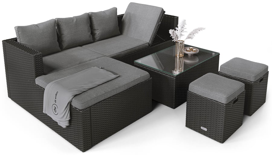 Die Gartenmöbel Bologna von di volio sind ein praktisches und komfortables Set, das sich dank der Kombination mehrerer Funktionen perfekt zum Entspannen im Freien und zum Beisammensein mit geliebten Menschen eignet. Die Sitzgruppe Bologna kann als Lounge- oder als Couchgarnitur eingesetzt werden. Das Set besteht aus einem geräumigen Ecksofa mit Liegefunktion, zwei Hockern und einem Couchtisch mit Platte aus gehärtetem Glas. Die Outdoor-Möbel bestehen aus handgefertigtem Polyrattan-Geflecht, das wie natürliches Rattan aussieht, aber um ein Vielfaches haltbarer und wetterbeständiger ist als dieses. Die Sitzflächen und Rückenlehnen der Möbel sind mit weichen Kissen ausgestattet, die für ein komfortables Sitzerlebnis sorgen. Das moderne Design der Sitzgruppe Bologna kombiniert modernistische, kubische Formen mit einem natürlich wirkenden Polyrattan-Geflecht. So präsentieren sich die Möbel in jedem Garten oder auf jeder Terrasse schön, egal in welchem Stil.