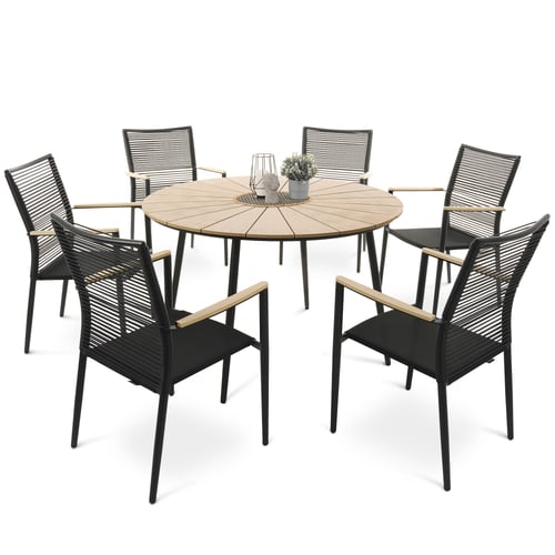 Das Gartenmöbel-Set Acona von di volio eignet sich perfekt für die Einrichtung jedes Gartens oder jeder Terrasse. Es bietet nicht nur einen wohltuenden Platz zum Entspannen im Freien, sondern schafft auch einen Sitzbereich für Familienfeiern und Feste. Die Sitzgruppe besteht aus einem runden Tisch mit einer geräumigen Tischplatte und sechs bequemen Stühlen mit Armlehnen. Die Outdoor-Möbel zeichnen sich durch eine hochwertige Verarbeitung und die Verwendung langlebiger Materialien aus, die gegen Feuchtigkeit und wechselnde Witterungsbedingungen resistent sind. Das Zusammenspiel einer leichten, aber robusten Aluminiumkonstruktion mit Gewebe Textilene und Polyrattan in Tiefschwarz und kontrastierenden Kunstholz-Elementen in einem natürlichen Beigeton verleiht den Möbeln einen eleganten, ästhetisch ansprechenden Look. So fügen sich die Gartenmöbel Acona sowohl in klassische als auch in moderne Arrangements ein.
