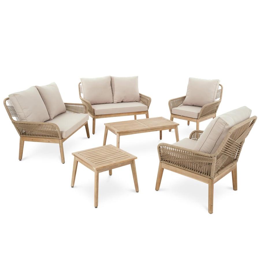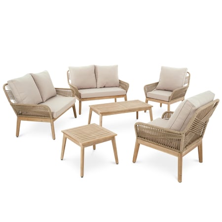 Das Gartenmöbel-Set Akaia von di volio ist eine große, umfangreiche Sitzgruppe, die sich perfekt für die Einrichtung eines Sitzbereichs im Garten oder auf der Terrasse eignet. Es bietet Platz zum Entspannen und für Familientreffen im Freien. Das Set besteht aus zwei Zweisitzer-Sofas, zwei Sesseln und zwei Couchtischen in verschiedenen Größen (klein und groß). Das Design der Möbel kombiniert moderne und langlebige Materialien wie strapazierfähige Polypropylen-Kordel und pulverbeschichteten Stahl mit einem traditionellen Rohstoff – Akazienholz. Diese harmonische Kombination aus klassischen und modernen Akzenten verleiht den Gartenmöbeln Akaia einen universellen Charakter, der sie in jeder Einrichtung gut aussehen lässt. Bequeme Kissen in einem gedämpften Beigeton vervollständigen das Set.