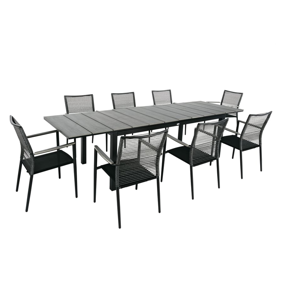 Das Herzstück des Gartenmöbel-Sets Basita ist ein beeindruckender, ausziehbarer Esstisch mit einer Länge von bis zu 300 cm, an dem problemlos 8 bis 12 Personen Platz finden. Mit seinem robusten Aluminiumrahmen in Mattschwarz zeichnet sich der Tisch durch eine außergewöhnliche Witterungsbeständigkeit aus und bleibt dabei dennoch leicht. Dies ist ein großer Vorteil angesichts seiner Größe – das Möbelstück lässt sich mühelos im Garten oder auf der Terrasse umstellen.