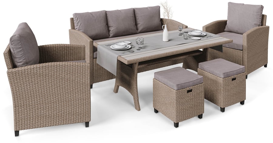 Gartenmöbel GENOVA von di volio, Set besteht aus 2 Sesseln, 2 Hockern, einem 3-Sitzer-Sofa und einem großen Tisch mit einer Platte aus Holzimitat. Jetzt zugreifen!