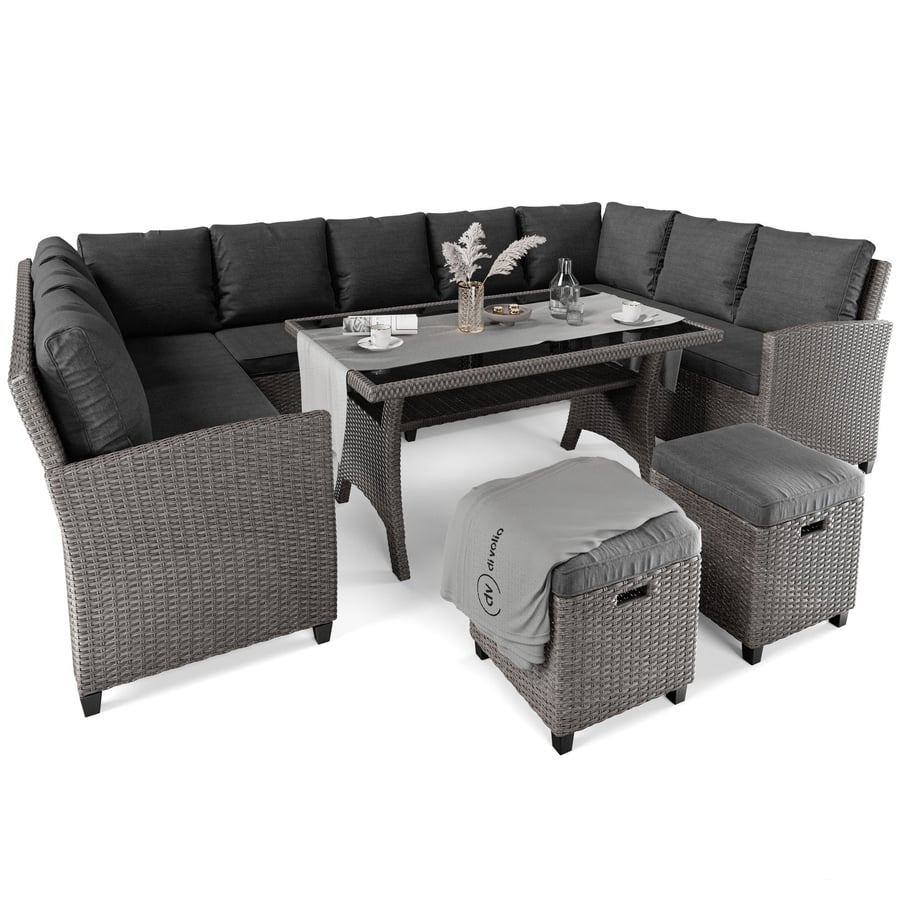 Die Sitzgruppe Livorno von di volio ist ein großes, bequemes und funktionales Gartenmöbel-Set, das für entspannte Momente und ein angenehmes und komfortables Beisammensein im Freien sorgt. Das Set eignet sich hervorragend als Terrassenmöbel. Aber auch im Garten sieht es schön aus, wenn Sie eine Familienfeier organisieren oder Freunde zu einem saisonalen Grillfest einladen. Das Gartenmöbel-Set Livorno besteht aus einem 9-Sitzer-Ecksofa in U-Form, einem großen Tisch mit Glasplatte und zwei Hockern. Die Möbel sind aus Polyrattan geflochten, das wie natürliches Rattan aussieht, aber um ein Vielfaches haltbarer und widerstandsfähiger gegen alle Wetterbedingungen ist. Die hohe Qualität der Polyrattan-Fasern zeigt sich in ihrer Struktur und Form. Die abgerundeten geflochtenen Fasern sehen sehr natürlich aus, was die Outdoor-Möbel noch schöner macht. Die Sitzgruppe Livorno wird durch weiche Kissen ergänzt, die ihr eine gemütliche und idyllische Note verleihen.