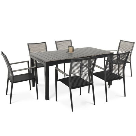 Maletto ist ein komfortables und funktionales Gartenmöbel-Set, das sich perfekt für Garten und Terrasse eignet. Es sorgt nicht nur für ein bequemes Entspannen für die ganze Familie, sondern lädt auch zum gemeinsamen Essen und Feiern im Freien ein. Die Sitzgruppe besteht aus einem großen Tisch mit ausziehbarer Tischplatte und sechs Stühlen mit Armlehnen. Die Außenmöbel sind aus modernen, hochwertigen Materialien gefertigt – Aluminium, Kunstholz, Polyrattan und Gewebe Textilene. Sie sorgen für eine lange Lebensdauer, Wetterbeständigkeit, Nutzungskomfort und ein ästhetisches Aussehen. Das minimalistische Design der Gartenmöbel, das auf geometrischen, einfachen Formen basiert, und die gedeckte Farbgebung (elegantes Mattschwarz und Grau) verleihen dem Set Maletto einen modernen, universellen Charakter und einen stilvollen Look. So lässt es sich in jede Einrichtung integrieren.