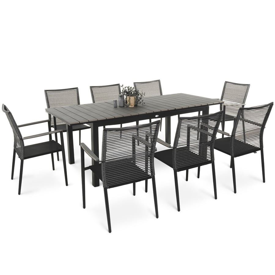 Maletto ist ein umfangreiches Gartenmöbel-Set, das sich perfekt für Garten und Terrasse eignet. Es sorgt nicht nur für ein bequemes Entspannen für die ganze Familie, sondern lässt sich auch für Partys und gesellige Abende im Freien nutzen. Die Sitzgruppe besteht aus einem großen Tisch mit ausziehbarer Tischplatte und acht Stühlen mit bequemen Armlehnen. Sie bietet Platz für acht Personen. Die Outdoor-Möbel bestehen aus modernen, hochwertigen Materialien. Sie sorgen für eine lange Lebensdauer, Wetterbeständigkeit, Nutzungskomfort und ein ästhetisches Erscheinungsbild. Die Aluminiumkonstruktion des Tisches und der Stühle in elegantem Schwarz wird durch Elemente aus grauem Kunstholz, Polyrattan-Geflecht und strapazierfähiges Gewebe Textilene abgerundet. Das schlichte, sparsame Design der Gartenmöbel und die gedeckte Farbgebung verleihen dem Set Maletto ein modernes, universelles Flair und eine stilvolle Ausstrahlung, die es in jedem Outdoor-Styling gut aussehen lässt.