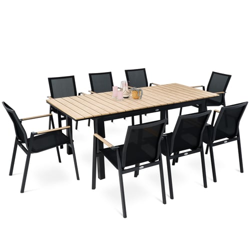 Das Gartenmöbel-Set Miranno von di volio bietet eine Kombination aus stilvollem Look, Komfort und praktischen Lösungen. Die Sitzgruppe beinhaltet einen großen Esstisch mit einer ausziehbaren Kunstholzplatte in schöner Holzoptik sowie acht ergonomisch geformte Stühle mit Armlehnen und bequemen Sitzflächen aus Gewebe Textilene. Die verwendeten Materialien garantieren eine hohe Haltbarkeit und Widerstandsfähigkeit der Gartenmöbel gegen Feuchtigkeit, UV-Strahlung und verschiedene Witterungseinflüsse. So können Sie sich viele Saisons lang an ihrem ästhetischen Aussehen erfreuen. Zudem gewinnen die Outdoor-Möbel an Funktionalität. Dazu tragen die Stapelbarkeit der Stühle zur einfachen Lagerung sowie die Höhenverstellbarkeit der Tischbeine zum Ausgleichen von Bodenunebenheiten bei. Ein modernes Design, das auf schlichten Formen und einer begrenzten Farbpalette basiert und klassisches Schwarz mit Naturbeige kombiniert, verleiht dem Set Miranno einen eleganten Look. So lässt sich die Sitzgruppe perfekt in jede Garten- oder Terrasseneinrichtung integrieren.