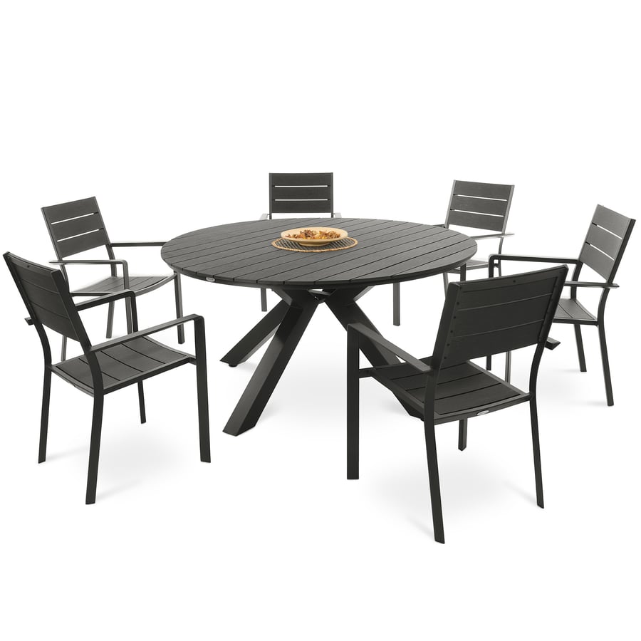 Gartenmöbel-Set Osimo für 6 Personen von di volio, robuste Konstruktion aus Aluminium und Kunstholz, runder Tisch 150 cm und 6 stapelbare Stühle in Schwarz.