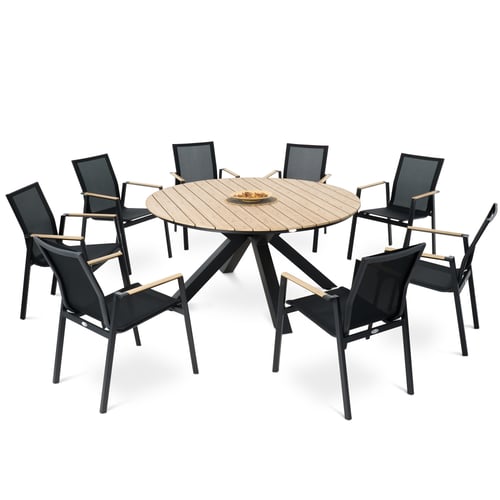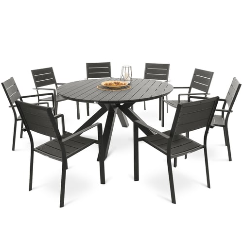 Gartenmöbel-Set Osimo für 8 Personen von di volio, robuste Konstruktion aus Aluminium und Kunstholz, runder Tisch 150 cm und 8 stapelbare Stühle in Schwarz.