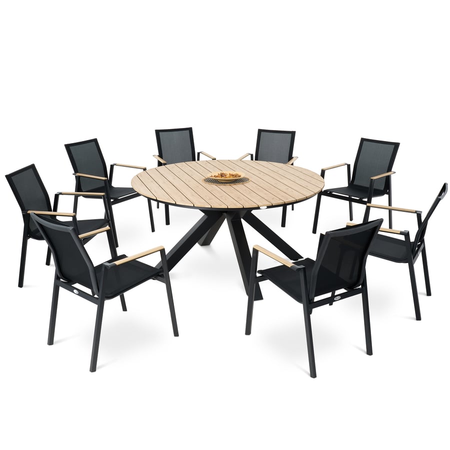 Das Gartenmöbel-Set Ozzano von di volio ist ideal für alle, die auf der Suche nach stilvollen, komfortablen und langlebigen Gartenmöbeln sind, die dem Außenbereich eine praktische Dimension und neue Funktionen verleihen. Die Sitzgruppe besteht aus einem großen Esstisch und acht Stühlen. Sie eignet sich für den Alltag ebenso wie für besondere Anlässe wie Familienfeiern oder Gartenpartys. Die runde Form des Tisches fördert ein entspanntes Gespräch und die Integration aller Gäste. Die Stühle mit Armlehnen und ergonomisch geformten Sitzflächen und Rückenlehnen garantieren auch bei längerem Gebrauch Komfort. Neben ihrer Funktionalität zeichnen sich die Outdoor-Möbel auch durch ihre Langlebigkeit und Wetterbeständigkeit aus. Dank der Kombination aus Aluminiumkonstruktion, Elementen aus Kunstholz und Gewebe Textilene nehmen die Möbel auch bei Feuchtigkeit, UV-Strahlen und Temperaturschwankungen keinen Schaden. Die verwendeten Materialien sorgen für eine schöne Ästhetik der Möbel und verleihen ihnen einen modernen und zugleich universellen Look. So fügt sich die Sitzgruppe Ozzano perfekt in jede Garten- oder Terrassengestaltung ein.