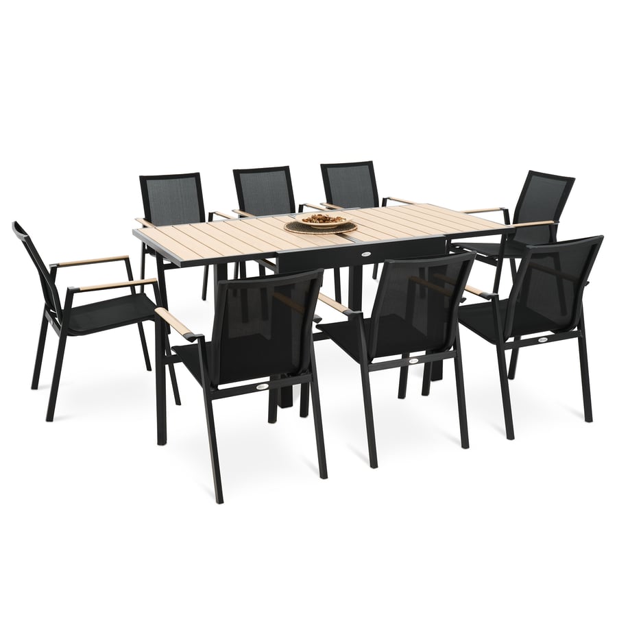 Das Gartenmöbel-Set Pejo von di volio ist ein Vorschlag für Personen, die modernes Design und praktische Lösungen schätzen. Diese umfangreiche Sitzgruppe mit familiärem Charakter eignet sich ideal für Feste im Freien, geselliges Beisammensein und tägliches Relaxen im Garten oder auf der Terrasse. Das Set Pejo besteht aus einem großen, ausziehbaren Tisch, der Platz für Hausbewohner und Gäste bietet, und acht bequemen Stühlen mit Armlehnen. Hohe Verarbeitungsqualität und Langlebigkeit der verwendeten Materialien sind die Merkmale dieser Gartenmöbel. Die Kombination aus Aluminiumkonstruktion, strapazierfähigem Gewebe Textilene und Kunstholz-Elementen in Holzoptik verleiht den Outdoor-Möbeln ein leichtes, ästhetisches Erscheinungsbild und eine hohe Witterungsbeständigkeit. Dies sorgt für ihre lange Lebensdauer. Die Gartenmöbel Pejo zeichnen sich durch ein elegantes Design aus, das auf der Schlichtheit der Formen und einer universellen Farbgebung – klassischem Schwarz und Naturbeige – basiert.