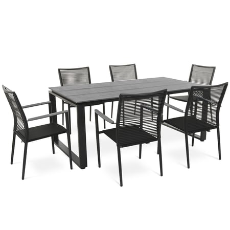 Das Gartenmöbel-Set Prezza von di volio, das aus einem großen Tisch und sechs bequemen Stühlen mit Armlehnen besteht, eignet sich perfekt für die Einrichtung eines Gartens oder einer größeren Terrasse. An einem geräumigen Tisch finden sechs Personen bequem Platz. So ist die Sitzgruppe Prezza der ideale Vorschlag für alle, die sich nicht nur im Garten entspannen, sondern auch Feste und Grillabende im Freien organisieren möchten. Die Outdoor-Möbel zeichnen sich durch eine präzise, solide Verarbeitung, die Langlebigkeit der verwendeten Materialien und ein elegantes Design aus. Die Aluminiumkonstruktion in Kombination mit Kunstholz, das das natürliche Aussehen und die Maserung von Echtholz imitiert, Polyrattan und Gewebe Textilene macht die Möbel robust und leicht und vor allem widerstandsfähig gegen wechselnde Witterungsbedingungen. Diese Eigenschaften garantieren eine lange Lebensdauer der Sitzgruppe. Der moderne, minimalistische Stil und die gedämpfte Farbgebung, die sich auf Schwarz und Grau beschränkt, sorgen dafür, dass das Gartenmöbel-Set Prezza einen universellen Charakter erhält. So lässt es sich in jede Einrichtung integrieren.