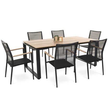 Das Gartenmöbel-Set Prezza von di volio, das aus einem großen Tisch und sechs bequemen Stühlen mit Armlehnen besteht, eignet sich perfekt für die Einrichtung eines Gartens oder einer größeren Terrasse. An einem geräumigen Tisch finden sechs Personen bequem Platz. So ist die Sitzgruppe Prezza der ideale Vorschlag für alle, die sich nicht nur im Garten entspannen, sondern auch Feste und Grillabende im Freien organisieren möchten. Die Outdoor-Möbel zeichnen sich durch eine präzise, solide Verarbeitung, die Langlebigkeit der verwendeten Materialien und ein elegantes Design aus. Die Aluminiumkonstruktion in Kombination mit Kunstholz, das das natürliche Aussehen und die Maserung von Echtholz imitiert, Polyrattan und Gewebe Textilene macht die Möbel robust und leicht und vor allem widerstandsfähig gegen wechselnde Witterungsbedingungen. Diese Eigenschaften garantieren eine lange Lebensdauer der Sitzgruppe. Der moderne, minimalistische Stil und die gedämpfte Farbgebung, die sich auf Schwarz und Beige beschränkt, sorgen dafür, dass das Gartenmöbel-Set Prezza einen universellen Charakter erhält. So lässt es sich in jede Einrichtung integrieren.