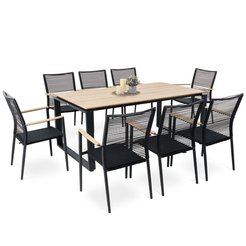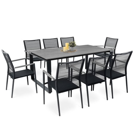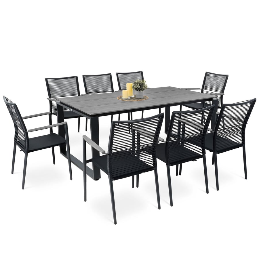 Die Sitzgruppe Prezza von di volio, die aus einem großen Tisch und acht bequemen Stühlen mit Armlehnen besteht, ist ein toller Vorschlag für die Einrichtung eines Gartens oder einer größeren Terrasse. An einem geräumigen Tisch finden acht Personen bequem Platz. So ist das Gartenmöbel-Set Prezza ideal für alle, für die der Garten nicht nur ein Rückzugsort ist, sondern auch ein Bereich für Familientreffen und gemeinsame Mahlzeiten im Freien. Die Outdoor-Möbel zeichnen sich durch eine präzise, solide Verarbeitung, die Langlebigkeit der verwendeten Materialien und ein elegantes Design aus. Die Aluminiumkonstruktion in Kombination mit Kunstholz, das das natürliche Aussehen von Holz perfekt nachahmt, Polyrattan und Gewebe Textilene macht die Möbel robust und leicht und vor allem widerstandsfähig gegen wechselnde Witterungsbedingungen. Diese Eigenschaften garantieren eine lange Lebensdauer der Sitzgruppe. Der moderne Stil und die gedeckten Farben, die sich auf Schwarz und Grau beschränken, lassen das Gartenmöbel-Set Prezza in jedem Styling gut aussehen.