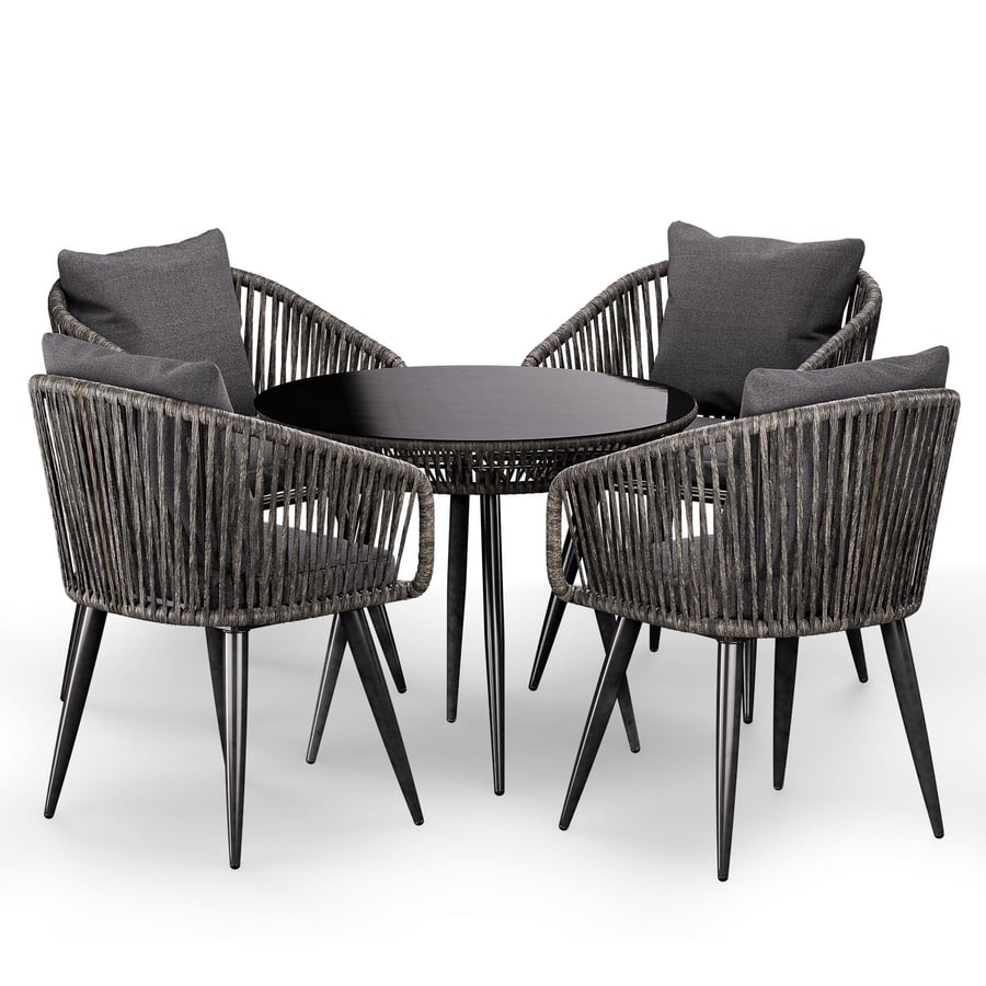 Die Konstruktion basiert auf weit auseinanderstehenden Tischbeinen, die Stabilität und hohe mechanische Belastbarkeit gewährleisten. Die ästhetische Umrandung aus Polyrattan-Kordel sorgt dafür, dass jeder Stuhl und der Tisch eine stimmige, harmonische Einheit bilden. Die graue Flechtstruktur harmoniert perfekt mit dem modernen Schwarz der Glasplatte.