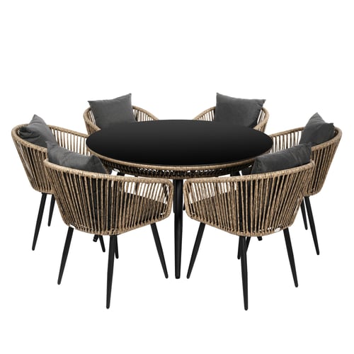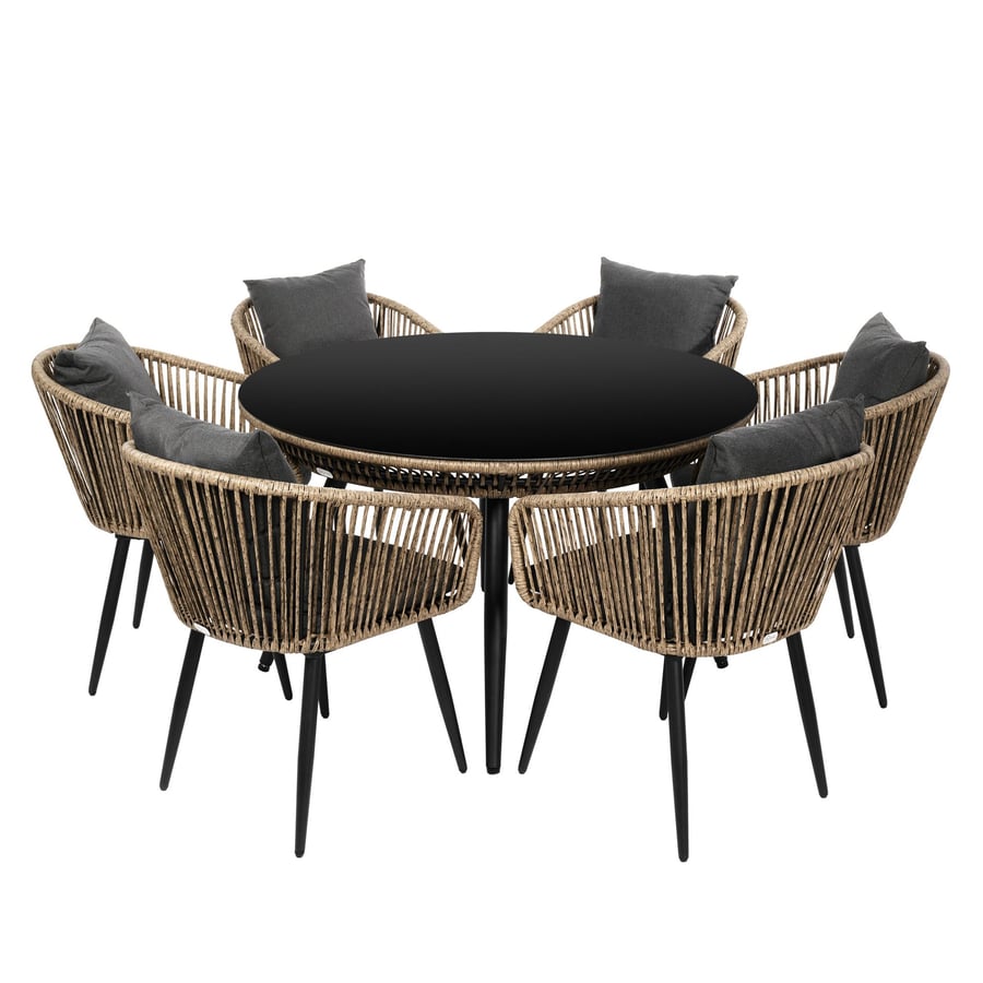 Abgerundet wird das Gartenmöbel-Set durch einen runden Tisch mit einem Durchmesser von 120 cm, an dem alle sechs Personen ihre Speisen und Getränke abstellen können. Zudem ist auch hier Platz für die passende Tischdekoration. Die Tischplatte besteht aus schwarzem, gehärtetem Glas, das kratzfest und leicht zu reinigen ist. Die Umrandung der Tischplatte aus Polyrattankordel in einem natürlichen Beigeton bezieht sich auf die Ästhetik der Stühle und bildet ein stimmiges und harmonisches Ganzes. Der große Abstand zwischen den Tischbeinen sorgt für Stabilität auch auf unebenem Untergrund.