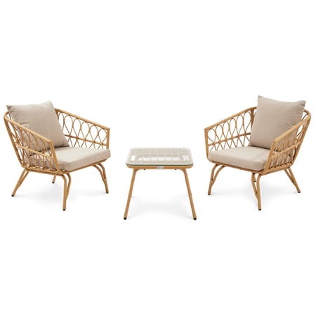 Das Balkonmöbel-Set für 2 Personen Savona ist eine einzigartige Kombination aus Klassischem und Modernem. Die Konstruktion der Outdoor-Möbel basiert auf einem soliden Stahlrahmen, der mit abgerundeten, hochwertigen Polyrattan-Fasern bedeckt ist. Das durchbrochene Geflecht in zartem Beige verleiht den Möbeln Leichtigkeit und einen unverwechselbaren Stil. Zudem sorgt es für sein natürliches Aussehen, das von traditionellen Rattan- und Korbmöbeln inspiriert worden ist. Das Set besteht aus zwei bequemen Sesseln mit einer abgerundeten Rückenlehne, die mit cremefarbenen Kissen ausgestattet sind, und einem Couchtisch mit einer Glasplatte. Dank seiner kompakten Größe eignet sich das Balkonmöbel-Set Savona nicht nur für den Garten und die Terrasse, sondern auch für den Balkon mit kleiner Fläche.
