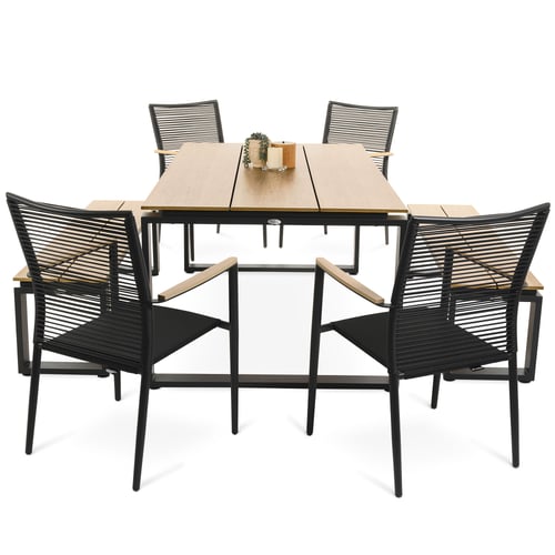 Gartenmöbel-Set Zerba von di volio, Tisch mit langlebiger Kunstholzplatte, zwei Gartenbänke und vier Stühle mit Armlehnen in Holzoptik, robust, stabil und wetterbeständig.