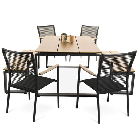 Gartenmöbel-Set Zerba von di volio, Tisch mit langlebiger Kunstholzplatte, zwei Gartenbänke und vier Stühle mit Armlehnen in Holzoptik, robust, stabil und Wetterbeständig.