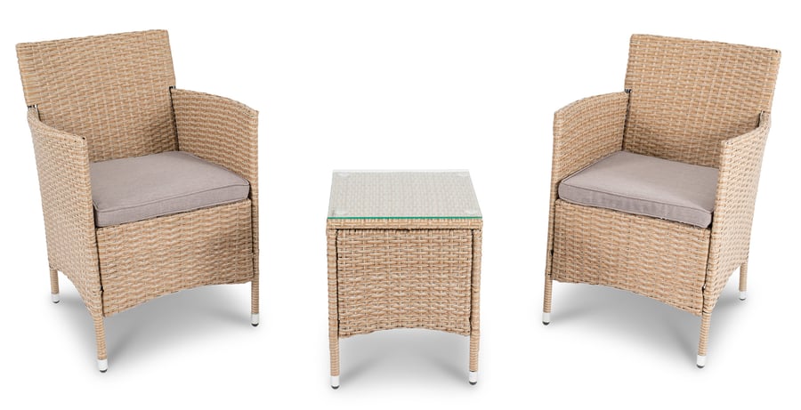 Die Sitzgruppe SIENA von di volio ist ein Set, mit dem Sie sich bequem im Garten oder auf der Terrasse entspannen und einen sonnigen Nachmittag oder einen Sommerabend genießen können. Das Set ist ideal für zwei Personen und besteht aus zwei bequemen Sesseln mit weichen Sitzkissen und einem Couchtisch mit einer Platte aus gehärtetem Glas. Jedes Element des Gartenmöbel-Sets besteht aus einem wetterfesten Polyrattan-Geflecht, dessen abgerundete Fasern in ihrer Struktur natürlichem Rattan ähneln. Sie verleihen den Möbeln ein ästhetisches Erscheinungsbild.