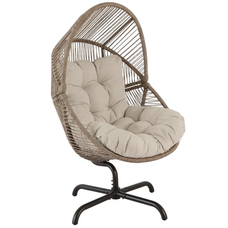 Der Kokon des Sessels besteht aus strapazierfähigem PE-Rattan in brauner Farbe. Die handgeflochtene Struktur ist resistent gegen Sonne, Feuchtigkeit und wechselnde Witterungsbedingungen und behält lange Zeit Form und Farbe. Das weiche Sitzkissen mit 15 cm Stärke, gefüllt mit PP-Baumwolle, sorgt für hohen Komfort auch bei längerem Verweilen. Dank Imprägnierung ist der Polyesterbezug pflegeleicht; Bindebänder halten das Kissen sicher an Ort und Stelle. Der drehbare Gartenstuhl Leno vereint Komfort, Funktionalität und Stil – perfekt für Garten, Terrasse, Balkon sowie auch für den Innenbereich als designstarker Relax- oder Hängesessel.