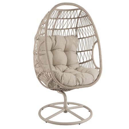 Beiger Gartensessel mit drehbarer Basis, hohem Korb aus Polyrattan und weichem 15-cm-Kissen. Komfortabler Outdoor- und Indoor-Sessel mit stabiler Konstruktion.