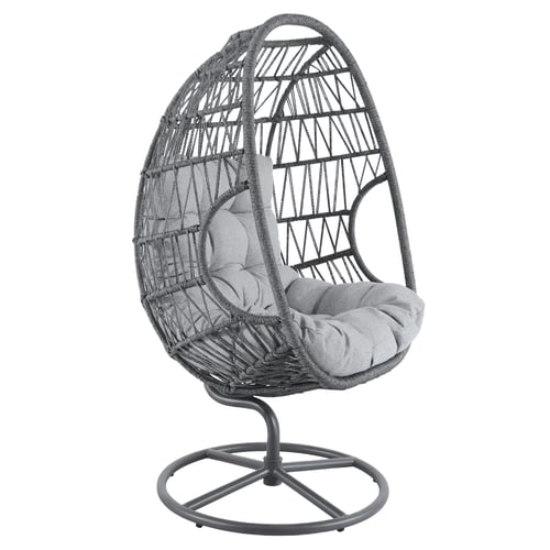 Grauer Gartensessel mit Drehfunktion, formstabilem Polyrattan-Korb und dickem Sitzkissen. Moderner Loungesessel für Garten, Terrasse oder Wohnraum.