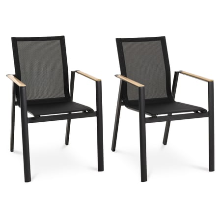 2er Set Gartenstühle Buti in Schwarz, aus robusten Materialien wie Aluminium und Gewebe Textilene, beständig gegen Feuchtigkeit, Korrosion und Ausbleichen, stapelbar.