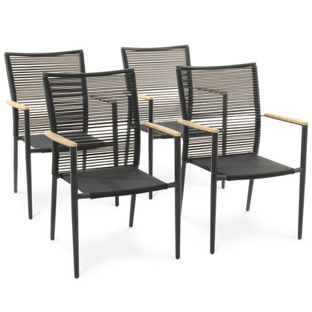 4er Set Gartenstühle Asti von di volio wurden mit Fokus auf Komfort und Funktionalität entworfen. Die Kombination einer leichten, aber sehr robusten Aluminiumkonstruktion mit hochwertigem Polyrattan und dem Gewebe Textilene, aus denen die Rückenlehne und die Sitzfläche gefertigt sind, sorgt für eine hohe Haltbarkeit und Witterungsbeständigkeit des Möbelstücks. Die Armlehnen aus Kunstholz, das Holz perfekt imitiert, runden das gesamte Erscheinungsbild ab. Mit seiner modernen, schlichten Form und seiner universellen Farbgebung (gedeckte Töne von Grau, Schwarz und Naturbeige) ist der Stuhl ein idealer Einrichtungsgegenstand für jeden Garten oder jede Terrasse. Er fügt sich perfekt in fast jede Einrichtung ein.