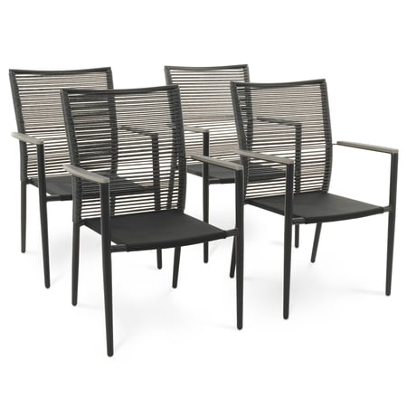 4er Set Gartenstühle Asti von di volio wurden mit Fokus auf Komfort und Funktionalität entworfen. Die Kombination einer leichten, aber sehr robusten Aluminiumkonstruktion mit hochwertigem Polyrattan und dem Gewebe Textilene, aus denen die Rückenlehne und die Sitzfläche gefertigt sind, sorgt für eine hohe Haltbarkeit und Witterungsbeständigkeit des Möbelstücks. Die Armlehnen aus Kunstholz, das Holz perfekt imitiert, runden das gesamte Erscheinungsbild ab. Mit seiner modernen, schlichten Form und seiner universellen Farbgebung (gedeckte Töne von Grau, Schwarz und Naturbeige) ist der Stuhl ein idealer Einrichtungsgegenstand für jeden Garten oder jede Terrasse. Er fügt sich perfekt in fast jede Einrichtung ein.