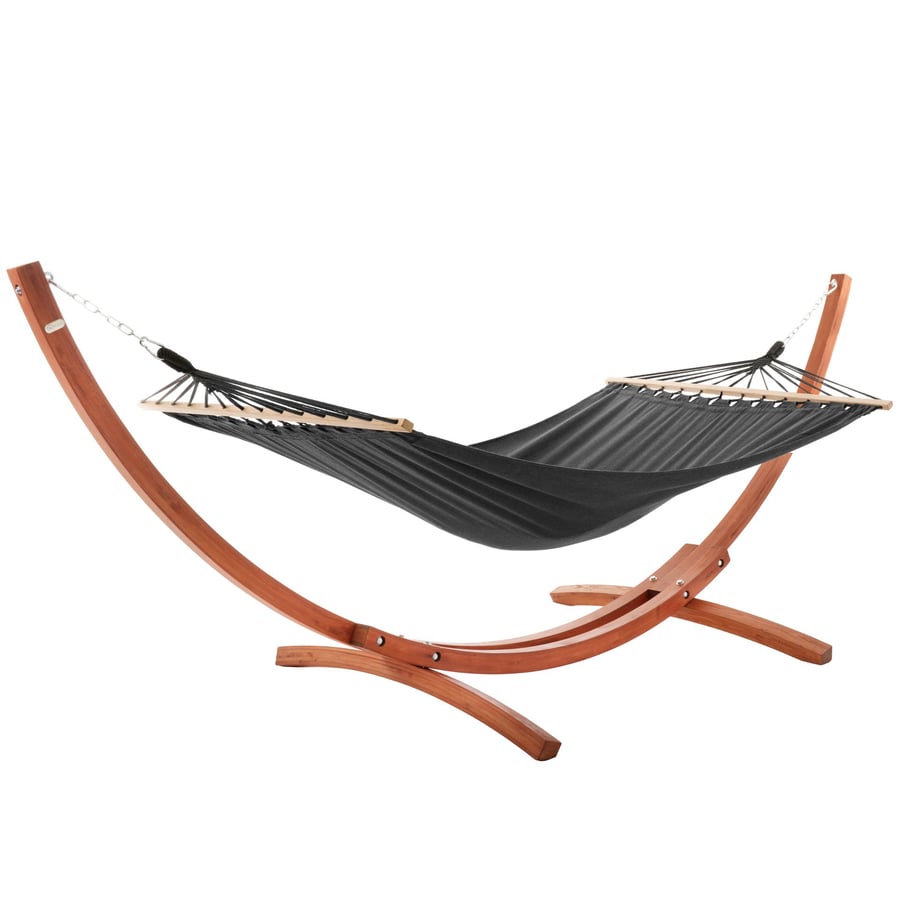 Das Segeltuch der Garten-Hängematte Trevia besteht zu 65% aus Baumwolle – so sorgt es für hohen Liegekomfort und außergewöhnliche Haltbarkeit. Der weiche und luftige Stoff passt sich dem Körper perfekt an und garantiert auch bei längerem Entspannen ein einzigartiges Liegeerlebnis. Die Hängematte ist mit robusten Spreizstangen ausgestattet, die den Stoff gleichmäßig spannen und so die Nutzung der Hängematte erleichtern. Die Karabinerhaken und das einfache Befestigungssystem sorgen dafür, dass die Hängematte schnell und einfach vom Gestell abgenommen werden kann, z.B. bei plötzlichem Wetterwechsel.