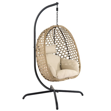 Der Sitz besteht aus robustem Polyrattan und Olefin-Seil, beides witterungsbeständige Materialien in einem eleganten Braunton. Das große, dicke Sitzkissen für den Hängesessel mit einer Stärke von 15 cm wurde so konzipiert, dass es Rücken und Sitzfläche gleichmäßig stützt und auch bei längerem Sitzen hohen Komfort bietet. Die weiche Füllung aus PPT-Baumwolle federt unter dem Körpergewicht angenehm nach und kehrt schnell in ihre ursprüngliche Form zurück. Ein verdeckter Reißverschluss erleichtert das Abnehmen des Bezugs zur Reinigung. Die abgerundete Form schafft einen typischen Hängesessel, in dem Sie nach der Arbeit oder bei einer gemütlichen Kaffeepause entspannen können – drinnen wie draußen.
