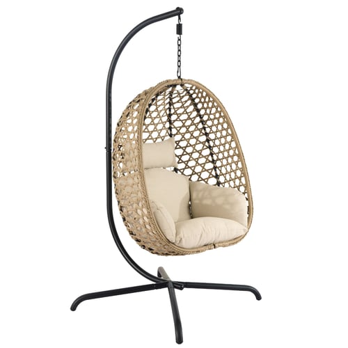 Eleganter, klappbarer Hängesessel in Braun für eine Person. Robuste Stahlkonstruktion, witterungsbeständiges Polyrattan und ein dickes Sitzkissen bieten hohen Komfort drinnen und draußen.
