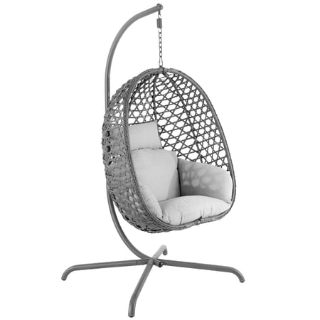 Moderner, klappbarer Hängesessel in Grau für eine Person. Stabile Stahlkonstruktion, witterungsbeständiges Polyrattan und dickes Sitzkissen sorgen für hohen Komfort im Innen- und Außenbereich.