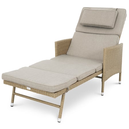 Relaxliege Breso in Beige von di volio, Sonnenliege aus Stahl und Polyrattan, Imprägnierte Kissenbezüge mit Reißverschlüssen, verstellbare Rückenlehne.