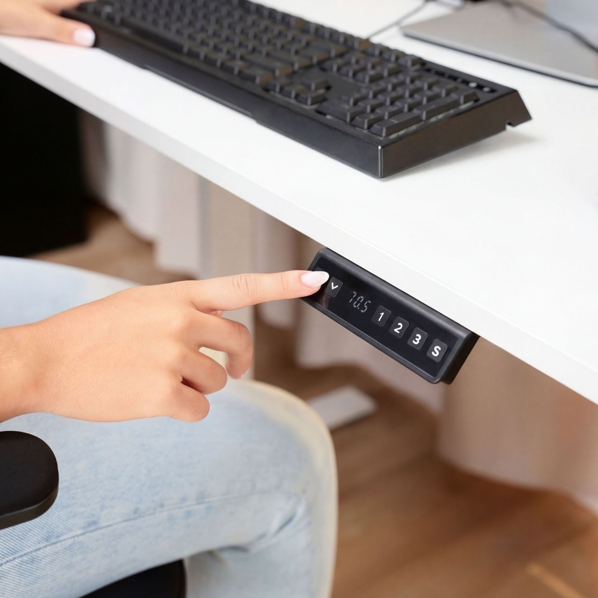 Rohový psací stůl Trani je vybaven elektrickým ovládacím panelem s intuitivními tlačítky a funkcí uložení tří oblíbených výškových nastavení. Mezi uloženými polohami můžete snadno přepínat jedním tlačítkem. Navíc stůl disponuje funkcí připomenutí změny polohy, což podporuje zdravý pracovní rytmus.