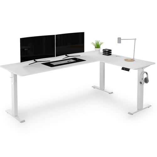 Moderní rohový psací stůl Trani s elektrickým nastavením výšky, prostornou pracovní deskou a řadou praktických funkcí. Ideální pro práci, studium i hraní her.