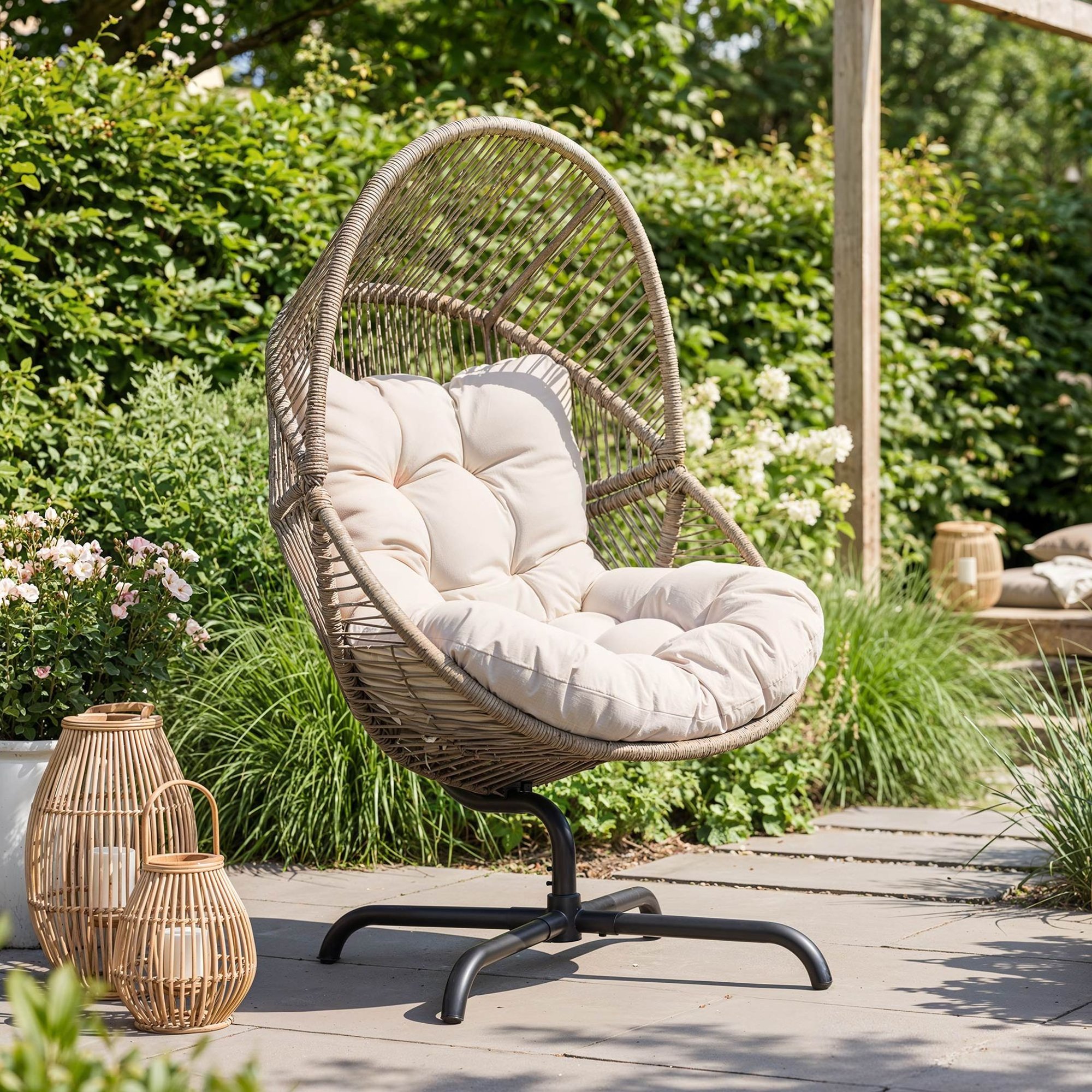Zahradní křeslo Leno o rozměrech 93 × 90 × 153 cm kombinuje pohodlí s pevnou konstrukcí. Čtyřramenná otočná základna zajišťuje plnou volnost pohybu a ocelový rám s práškovým lakováním v černém matu je odolný proti korozi. Konstrukce pod zahradní křeslo je navržena tak, aby křeslo stálo pevně a při používání se nekývalo. Unese zatížení až 150 kg, takže si v něm můžete komfortně odpočinout. Je ideální jako volně stojící křeslo na terasu, balkon nebo do zahrady.