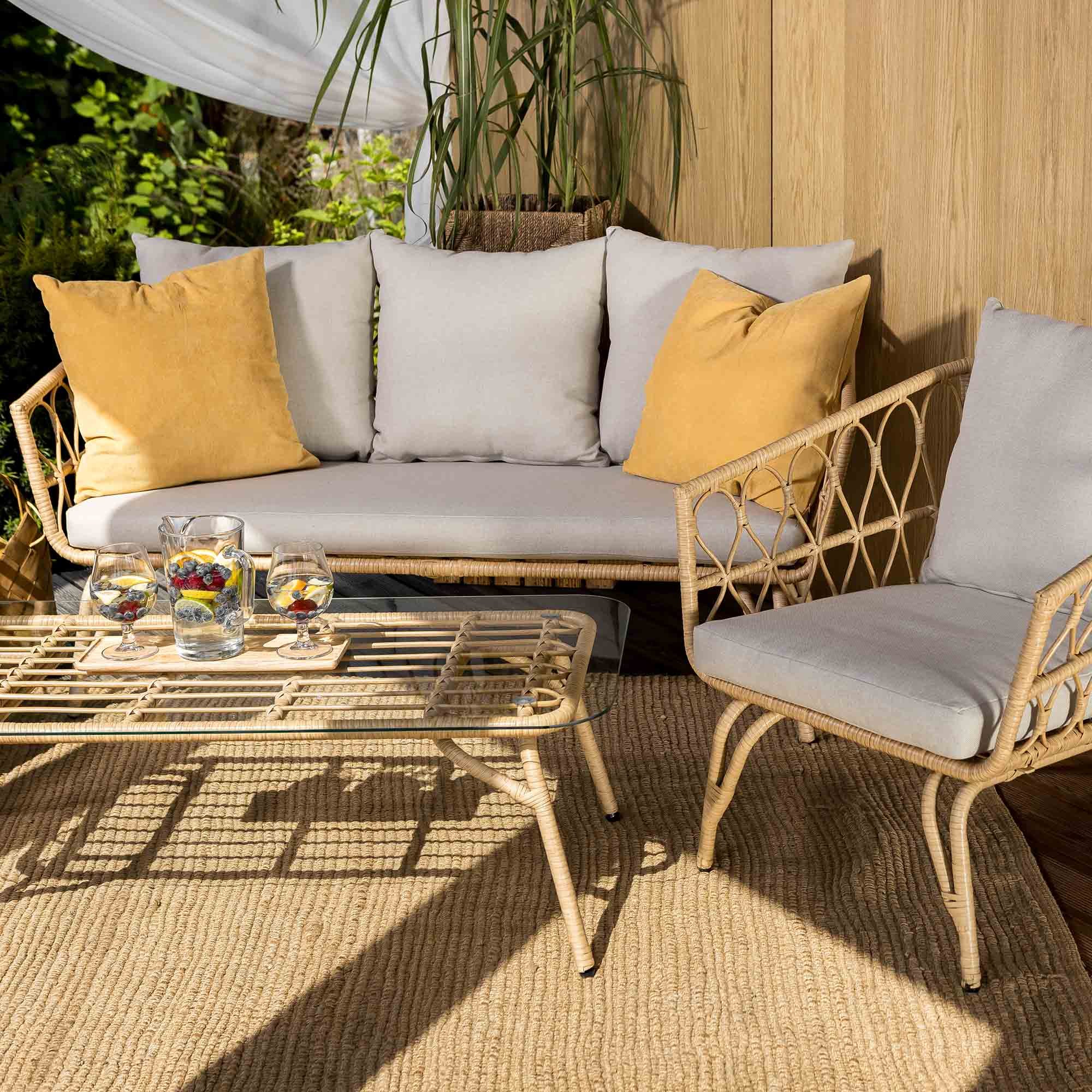 Souprava Teramo od di volio je pohodlná a funkční souprava nábytku, která bude vypadat krásně jak na zahradě, tak na terase. Sestava vyniká prolamovanou formou a designem odkazujícím na styl tradičního nábytku z přírodního ratanu a proutí. Konstrukcí nábytku je ocelový rám opletený kvalitními technorattanovými vlákny, která jsou na rozdíl od přírodního ratanu vysoce odolná vůči škodlivým vlivům vlhkosti a slunečního záření. Souprava obsahuje 3-místnou pohovku, dvě křesla se zaoblenými opěrkami a kávový stolek se skleněnou deskou. Celek doplňují měkké polštáře z impregnované látky ve světle šedém odstínu. Součástí soupravy je teplá polárová deka.