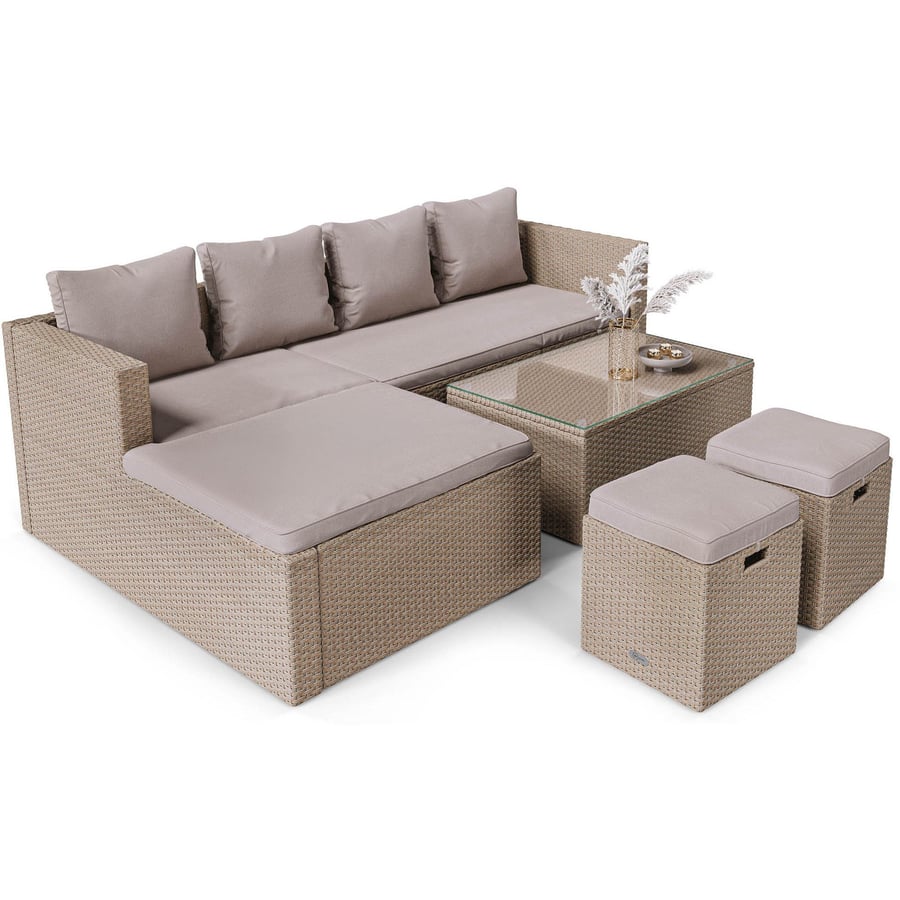 Sada zahradního nábytku Bologna Vám poskytne pohodlí a relax během posezení s rodinou a příteli. Souprava obsahuje pohovku, dva sedací pufy a kávový stolek. Sada Bologna je vybavena měkkými polštáři s impregnovanými potahy, které jsou odolné vůči vlhkosti a nečistotám.