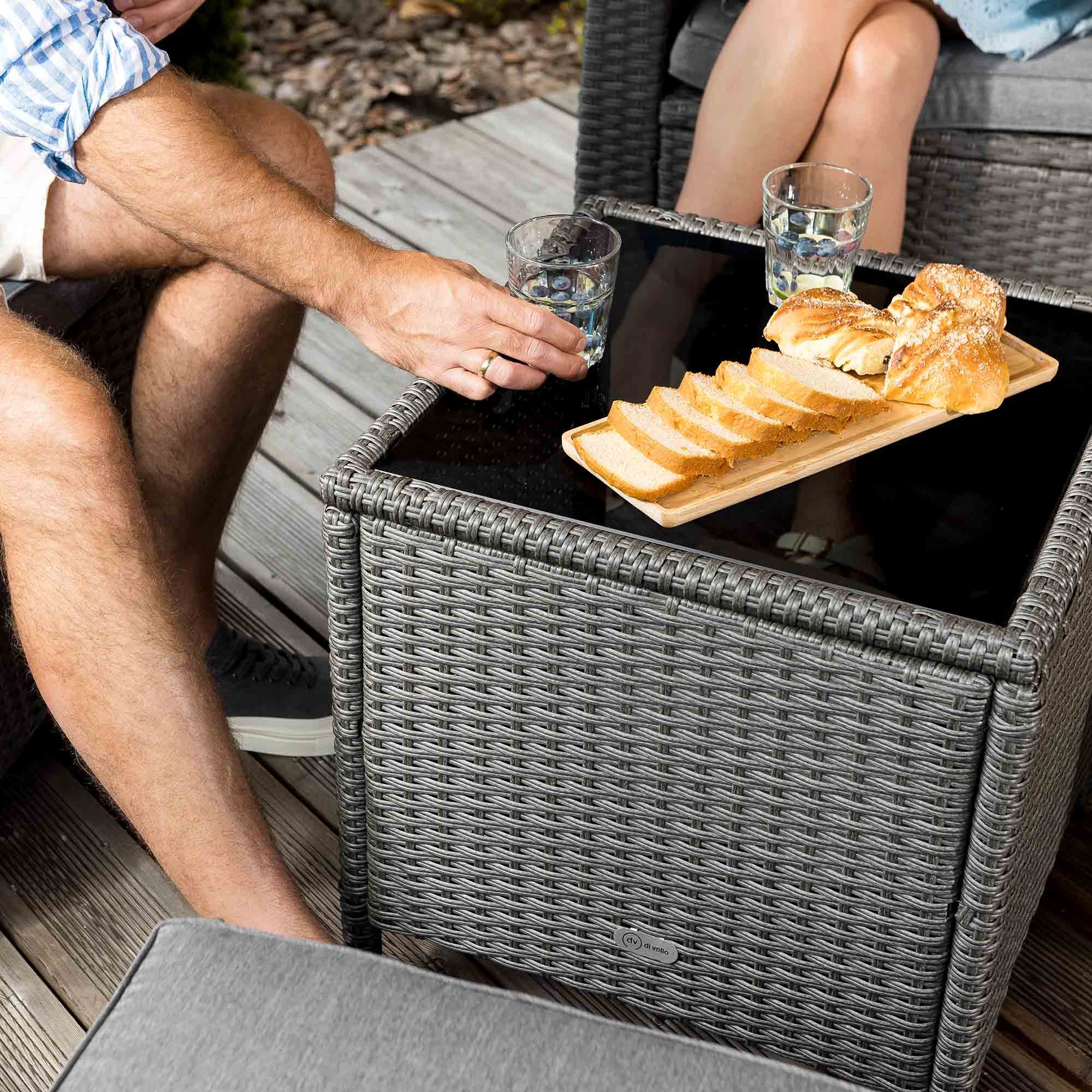 Pěkný konferenční stolek je dokonalým doplňkem k relaxační sestavě zahradního nábytku. Poskytuje prostor pro umístění tácu s občerstvením, sklenic s pitím nebo odložení oblíbené knihy. Deska stolu je vyrobena z tvrzeného skla o tloušťce 5 mm, černé, velmi odolné, voděodolné a snadno se udržuje v čistotě.