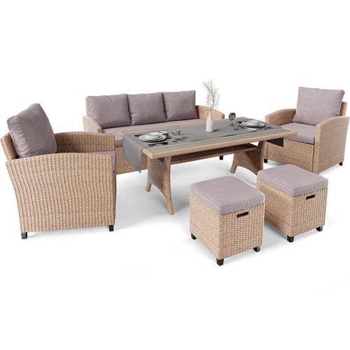 Sada zahradního nábytku Genova značky di volio z technoratanu s měkkými polštáři. Souprava obsahuje 2 křesla, 2 pufy, 3-místnou pohovku a velký stůl s deskou z imitace dřeva.