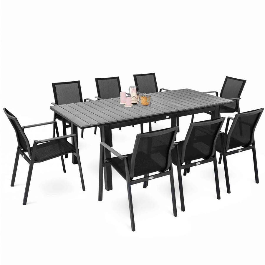 Sestava zahradního nábytku Miranno je kombinací stylového vzhledu s komfortem používání a praktickými řešeními. Sada obsahuje velký jídelní stůl s rozkládací deskou z polywoodu, která věrně reprodukuje vzhled přírodního dřeva, a osm ergonomických židlí s područkami a pohodlnými sedáky z textilie. Použité materiály zaručují trvanlivost a odolnost zahradního nábytku vůči vlhkosti, UV záření a různým povětrnostním vlivům, díky čemuž si zachovává svůj estetický vzhled po mnoho sezón. Nábytek navíc získává funkčnost díky možnosti stohování židlí pro usnadnění jejich skladování a nastavení výšky nohou stolu pro vyrovnání nerovností podlahy. Moderní design, založený na jednoduchosti tvarů a omezených barvách kombinující klasickou černou a přírodní odstín šedé, dodává nábytku Miranno elegantní vzhled a dělá tuto sestavu perfektní pro každou zahradu nebo terasu.