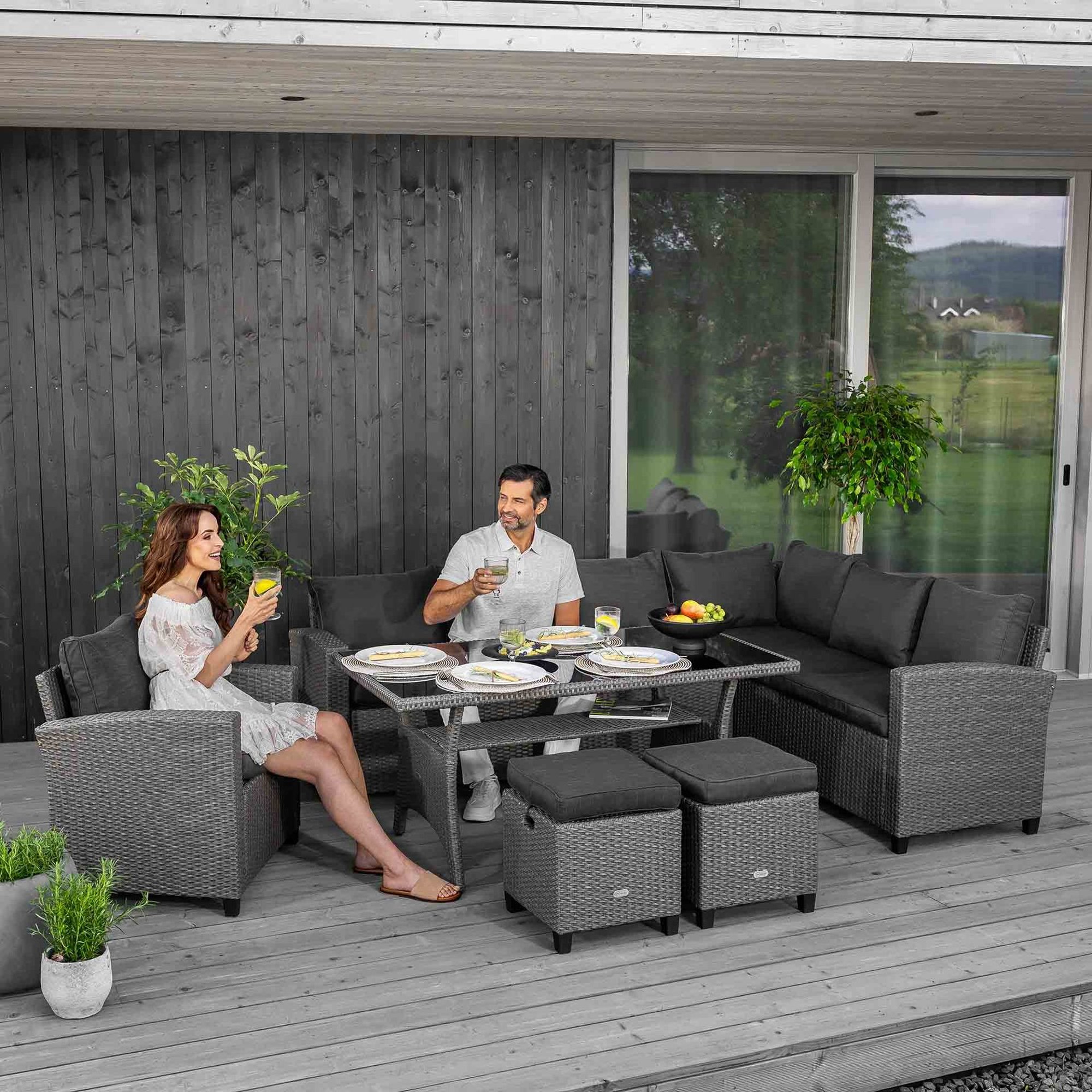 Modulární sada Rossano od di volio je pohodlný a funkční zahradní nábytek, který dobře poslouží jako vybavení terasy, balkonu nebo zahradního altánu. Nábytek je vyroben z kvalitního technoratanu, který je vysoce odolný vůči povětrnostním vlivům, extrémním teplotám a UV záření. Nábytek je ručně tkaný s velkým důrazem na detail. Díky zaobleným vláknům výplet připomíná přírodní ratan, který dodává nábytku estetický, přirozený vzhled. Měkké, tlusté polštáře na sedadlech a opěradlech zajišťují pohodlí a komfort používání. Souprava se skládá z velkého stolu, křesla, dvou taburetů a modulární rohové pohovky, kterou lze rozdělit na dvě samostatné pohovky. Odteď bude během zahradních párty a sezónních grilovaček dostatek místa pro všechny vaše hosty. Vícedílná sestava zahradního nábytku Rossano vám poskytne potřebný komfort.