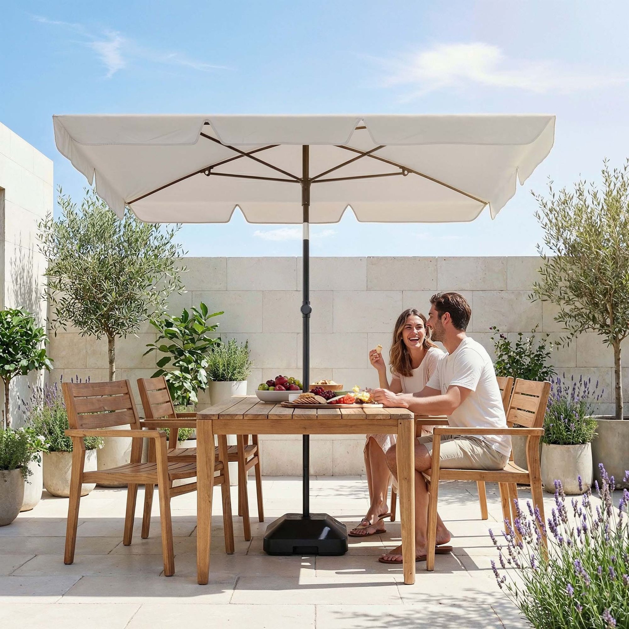 Krémový slunečník Ankona DV-148GU s nastavením sklonu a voděodolným materiálem se SPF 50 poskytne stín na terase, balkoně i na pláži.