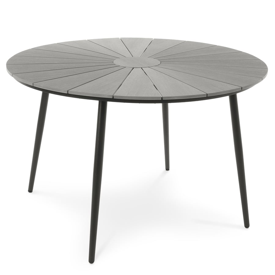 Zahradní stůl Palermo o průměru 120 cm vyrobený z hliníku a šedou deskou z polywoodu, dokonalé spojení funkčnosti, elegance a minimalistického stylu.